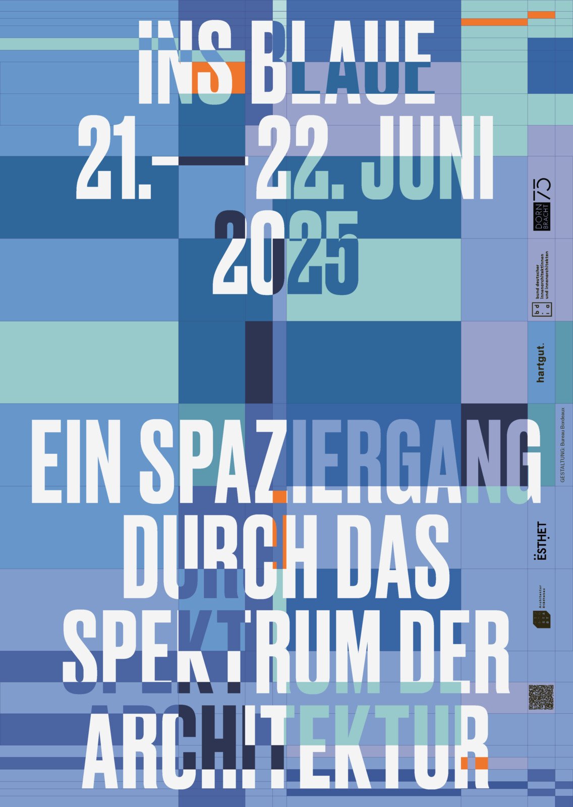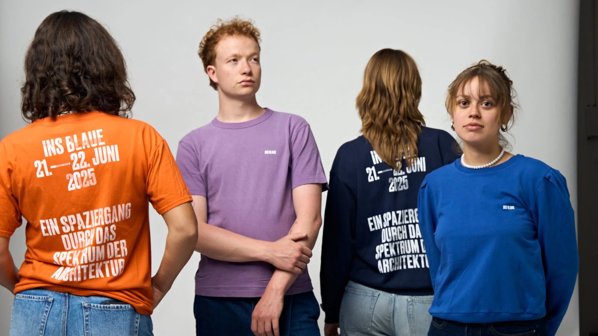 Für ‘INS BLAUE – Ein Spaziergang durch das Spektrum der Architektur’ haben wir eine mehrfarbige Kollektion aus T-Shirts, Sweatshirts und Longsleeves inspiriert von den Farben aus dem Corporate Design der Veranstaltung erstellt. Der Print war dem Plakat nachempfunden und so angelegt, dass er mit allen Farben kompatibel war.